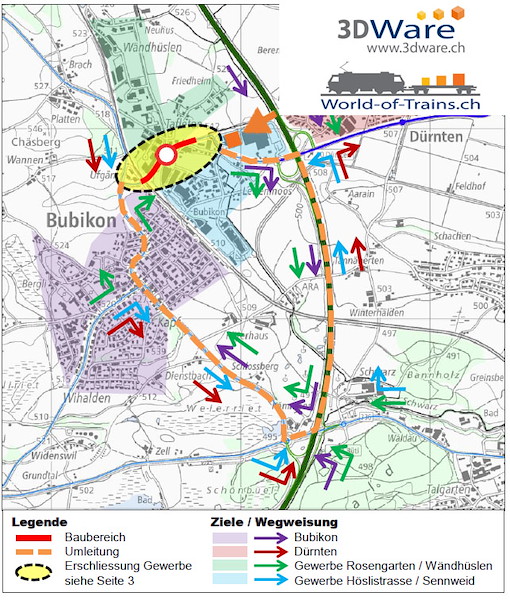 Die Dürtnerstrasse ist im jeweiligen Baubereich während der gesamten Bauzeit für sämtlichen Verkehr gesperrt. Der motorisierte Verkehr über die Kantonsstrassen und die Oberlandautobahn A15 umgeleitet.