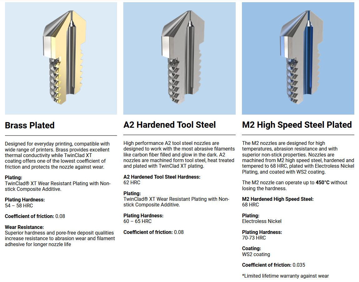 Beschichtete Messing Düse ist ideal für nicht abrasive Standard Filamente, und hat einen niedrigeren Reibungskoeffizienten was zu einem gleichmässigeren Fluss führt als bei der Standard Messingdüse.